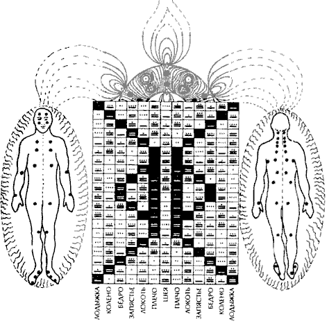 Из матрицы Цолькин следует, что 52 положения направленных указателей (13 чисел х 4 направления) образуют в рамках матрицы определенную структуру, по очертаниям похожую на стилизованную фигуру человека, так называемый Ткацкий Станок Майя. Эта структура – визуальный образ светового тела любой космической системы любого уровня развития, построенного по одинаковому принципу – принципу гармонического резонанса. Поэтому можно смело утверждать, что кроме информации об энергетическом строении Земли, Солнца, Вселенной, данная структура отражает строение энергетического тела человека с его сенсорным восприятием, центральным компьютером, чакрами и энергетическими каналами.. Световое тело человека работает в том же 260-элеменнтном ритме пульсаций, что и Солнце, планеты и все системы во Вселенной. 52 гармонизирующие точки, принадлежащие физическому телу и использующиеся в восточных точечных массажах, одновременно являются элементами светового тела Этим знанием, несколько в другой интерпретации, пользовались с незапамятных времен и пользуются сейчас истинные целители различных традиций, так называемые «видящие», т.е способные воспринимать энергетическое строение.