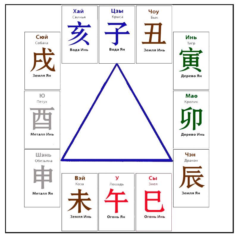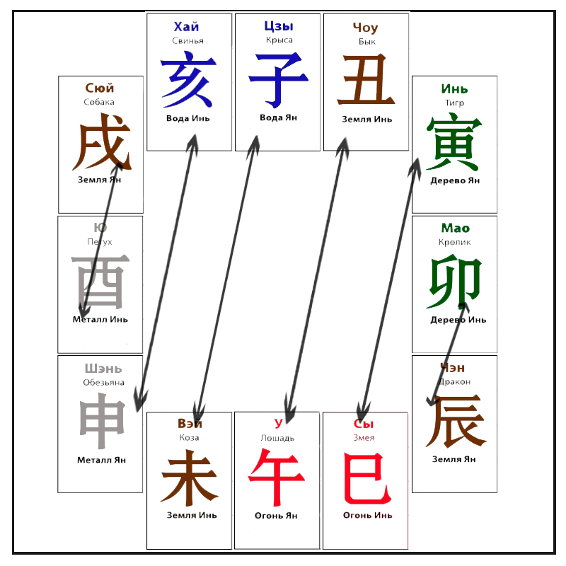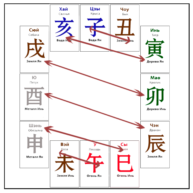 Итак все иероглифы во второй строчке карты Бацзы называются земными ветвями. А все животные которые попадают в эту самую земную ветвь взаимодействую друг с другом накладывая при этом на характер личности дополнительные характеристики. И надо отметить, что в системе Бацзы животные имеют очень сложные взаимоотношения.
